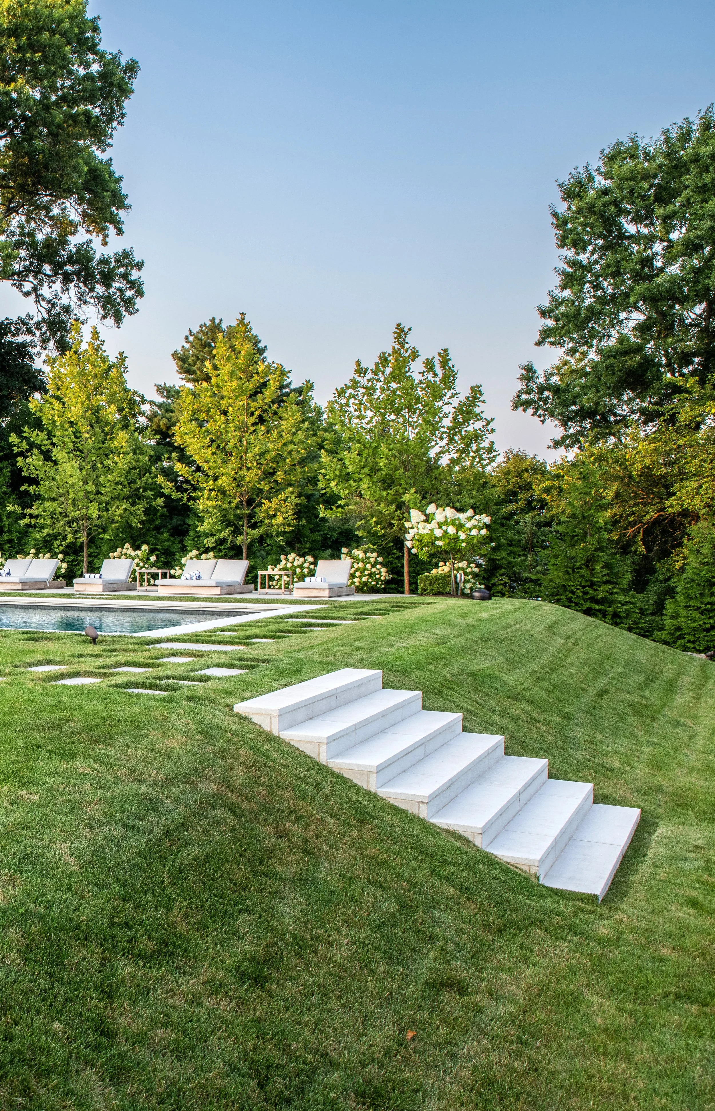 With a dramatic 26.5-foot grade change from the back door to the property line, the site demanded a distinctive approach—one rooted in shaping the land itself. The result is a series of gentle transitions that guide movement through multiple zones, seamlessly blending form and function. “We thought about it like designing a house,” says Rustici. “The first level becomes your outdoor living room and dining space. Then a few steps down, you’re in the pool zone. Step further, and it’s a play lawn.”